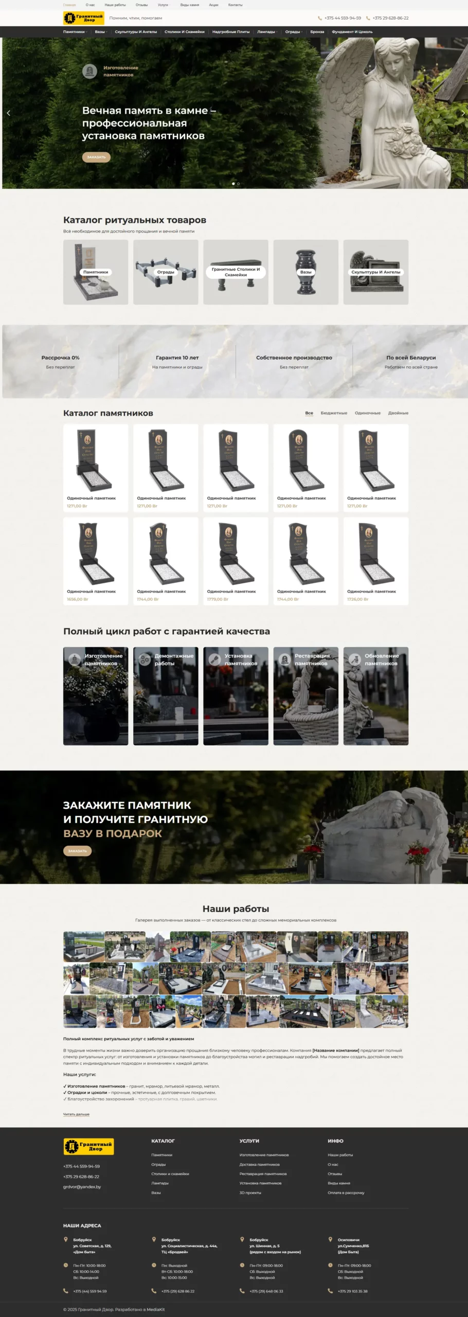 Разработали сайт-каталог для компании «Гранитный двор», специализирующейся на ритуальных услугах: изготовлении и продаже памятников, оград, ваз, надгробий и сопутствующих элементов благоустройства захоронений. Цель проекта — аккуратно, уважительно и профессионально представить ассортимент и услуги, повысить доверие целевой аудитории, упростить приём заявок и обеспечить удобное администрирование каталога.