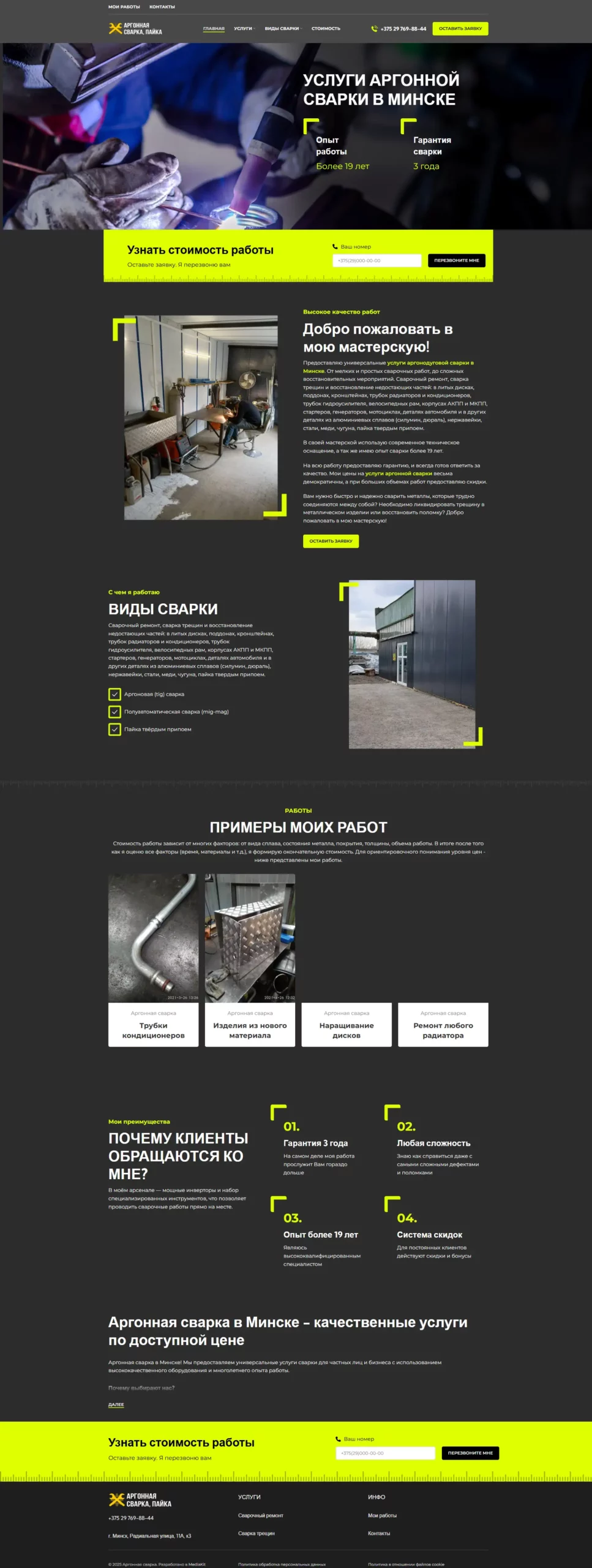 Создали продающий сайт для мастерской, специализирующейся на аргонно-дуговой сварке (TIG/MIG), пайке и восстановительном сварочном ремонте. Задача — показать экспертность в узкой технологической нише, обеспечить понятную воронку заявки и дать владельцу инструмент для самостоятельного управления контентом. На сайте представлены услуги, прайс и подробные страницы по типам работ — это помогает и клиентам, и поиску.