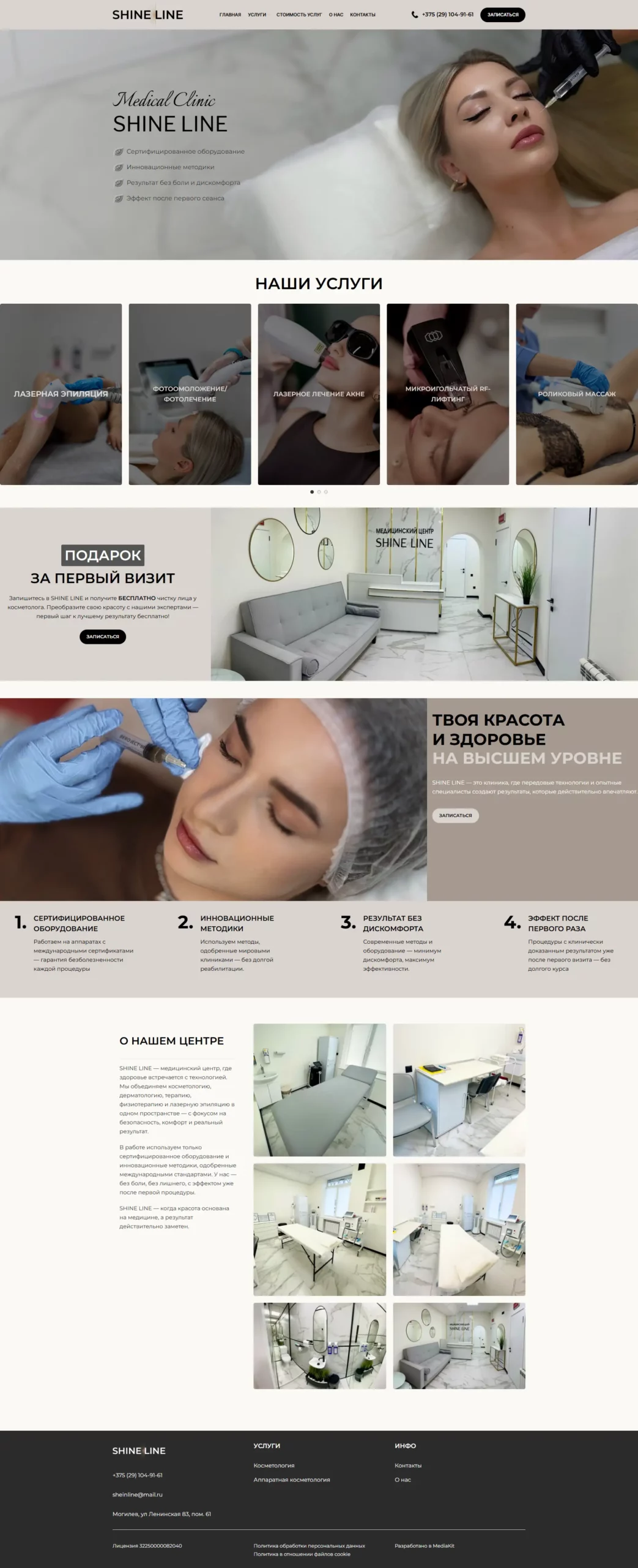 ShineLine — клиника аппаратной и эстетической косметологии в Могилёве. На сайте доступны страницы с перечнем услуг и прайсом, на ключевых страницах показано промо-предложение для первых посетителей, в подвале указан номер лицензии. Реализованы формы записи с возможностью выбрать направление и инициировать дату/заявку; поступающие заявки передаются владельцу/менеджеру.